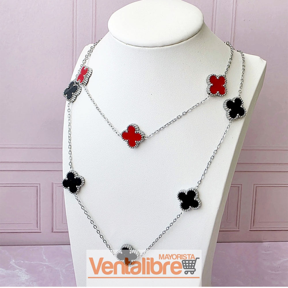 CADENA DE ACERO BLANCO GARGANTILLA CON TRÉBOLES ROJOS 40 CM. MÁS 5 CM. DE EXTENSIÓN