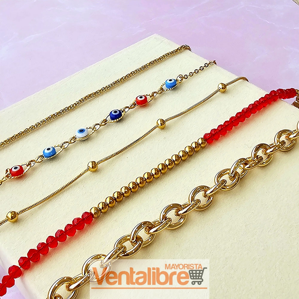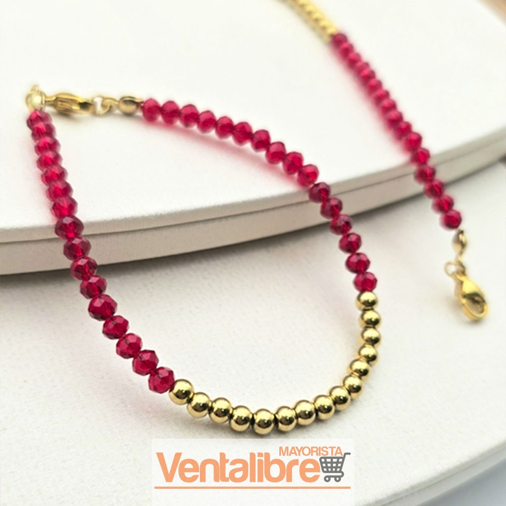PULSERA DE ACERO DORADO CON CRISTALES ROJOS Y BOLITAS 18 CM.