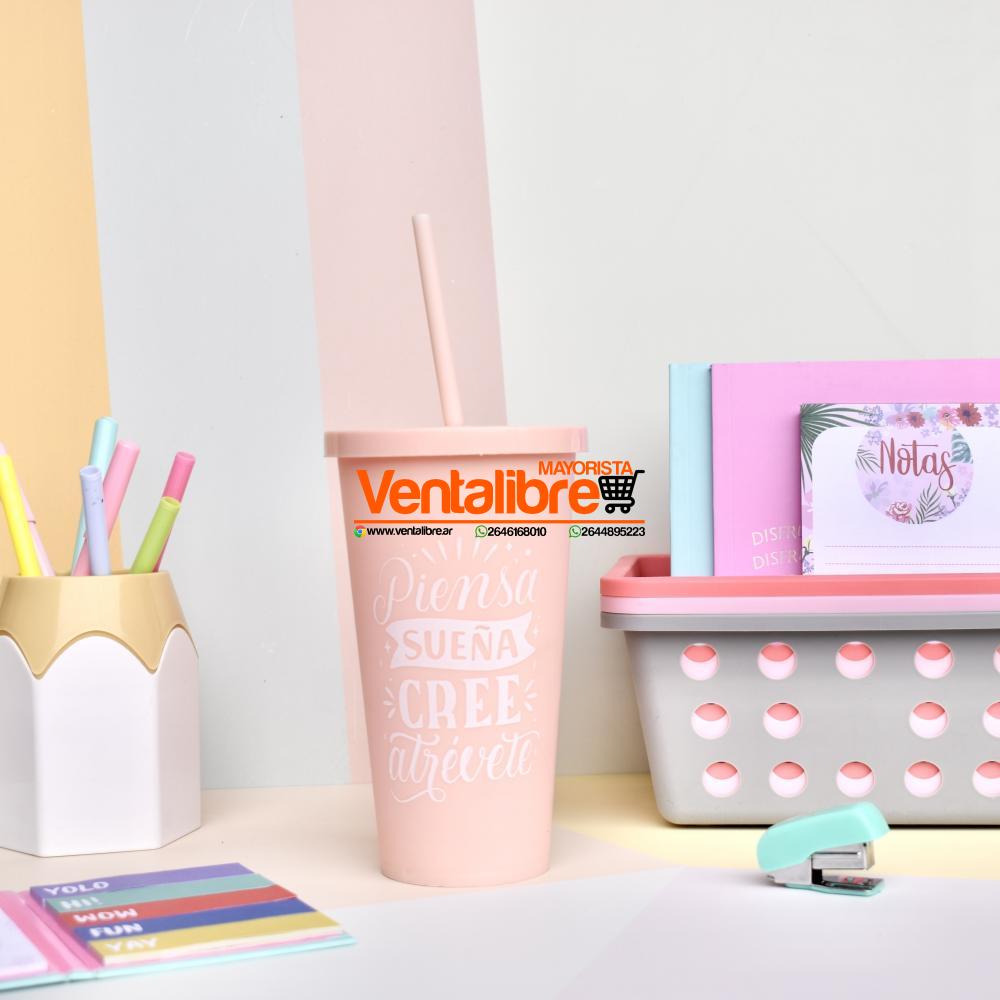 Vaso alto plástico con tapa encastrable y sorbete. Estampados en serigrafia plateada con frases positivas!